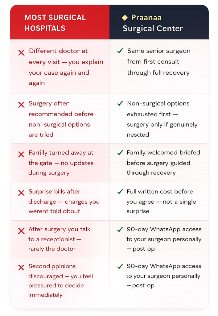 Big hospitals are built for volume. Praanaa is built for you. Here is exactly what that means in practice — compared to how most surgical hospitals in Hyderabad actually operate.